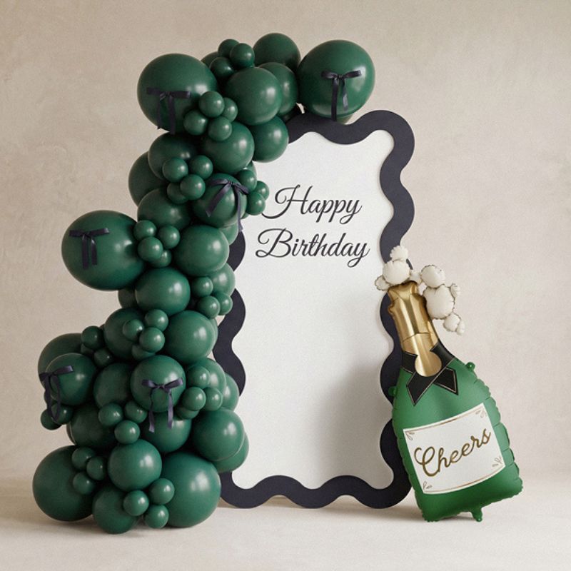 Balon Szampan w kolorze ciemnozielonym z napisem Cheers i bąbelkami będzie wspaniałym uzupełnieniem dekoracji na przyjęcie urodzinowe lub imprezę tematyczną. Można napełnić go powietrzem lub helem. Rozmiar po napompowaniu ok. 34 x 93 cm. Zestaw zawiera słomkę. Balon posiada haczyki ułatwiające montaż do dekoracji. Produkt wykonano z trwałego materiału foliowego, co pozwala na długie utrzymanie kształtu po napompowaniu. Podczas przygotowywania balonu do użycia należy zachować ostrożność, aby nie uszkodzić delikatnej powierzchni lub zaworu.