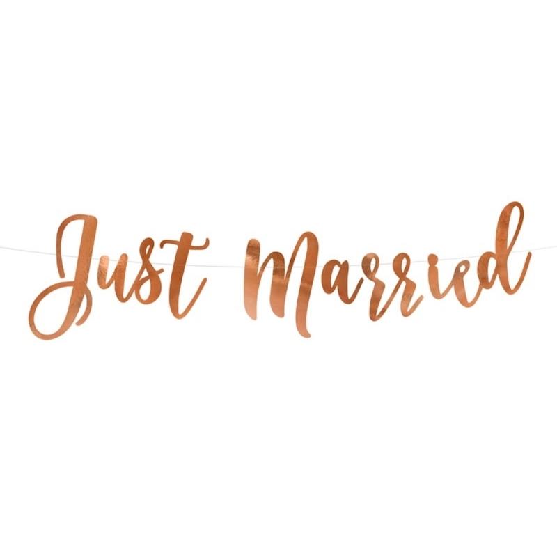 Baner Just Married różowe złoto to idealna dekoracja na przyjęcie weselne. Składa się błyszczących literek Just Married w kolorze różowego złota. Wymiary: wysokość ok 20 cm, długość ok. 77 cm.