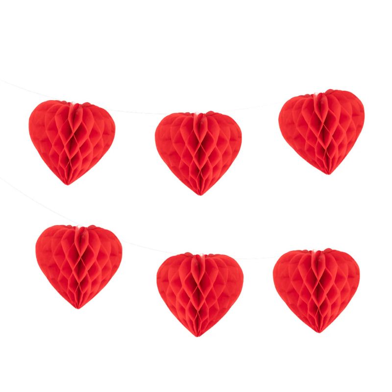 Girlanda serca bibułowe świetnie sprawdzi się jako wisząca dekoracja na Walentynki. W zestawie 9 papierowych serduszek typu honeycomb, o wymiarach 9 cm. Długość girlandy ok. 1,5 m. Długość sznureczka to ok. 2,2 m.