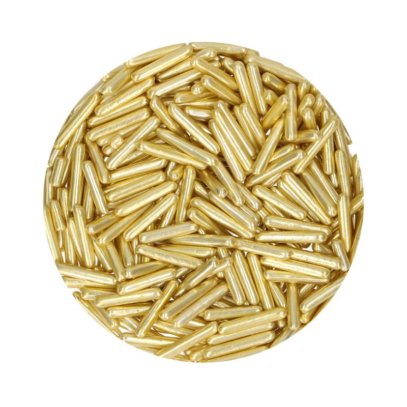 Posypka Złote Pałeczki Jasne Funcakes to cukrowa dekoracja, która z pewnością sprawi, że Twoje wypieki będą wyglądać wyjątkowo. Cukrowa posypka przyda się do ozdabiania takich wypieków jak np. torty, ciasta, babeczki, lizaki z ciasta w stylu cake pops. Będzie nadawać się wspaniale jako posypka do pierników. Kolorowe posypki do ciast to prosty sposób, żeby efektownie udekorować wypieki. Dzięki słoiczkowi z aplikatorem dozowanie posypki jest bardzo wygodne. Uwaga! Posypka nie nadaje się do zapiekania, ponieważ zawarty w niej cukier może zacząć się rozpuszczać. Waga: 70 g. Przechowywać w suchym i chłodnym miejscu, w temp. 12-22 st. C.