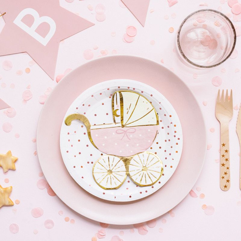 Serwetki Wózek Różowy – papierowe serwetki ze złotym błyszczącym nadrukiem. Będą wyjątkowym dodatkiem na przyjęcia typu Baby Shower i Gender Reveal Party. Ich oryginalny kształt wózka przyciąga uwagę i dodaje uroku każdej aranżacji stołu. Papierowe trójwarstwowe serwetki wykonane są z miękkiego i trwałego papieru, który łatwo się składa i układa na stole. Różowy kolor pasuje również do motywów dekoracyjnych związanych z narodzinami dziewczynki. Opakowanie zawiera 20 szt. papierowych trójwarstwowych serwetek o wymiarach 14 x 15 cm.