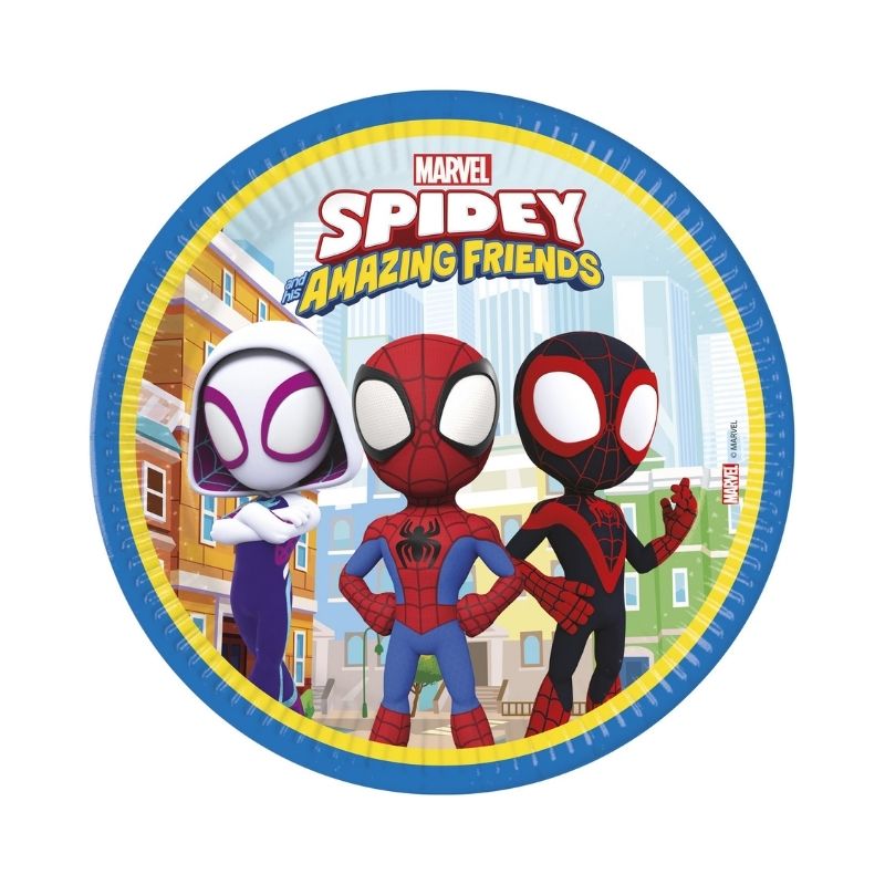 Talerzyki Spidey 23 cm – Dodaj superbohaterskiego stylu do swojego przyjęcia! Z talerzykami Spidey, każdy posiłek staje się przygodą! Zestaw 8 papierowych talerzyków Spidey 23 cm z postaciami z bajki Spidey mały Spiderman.